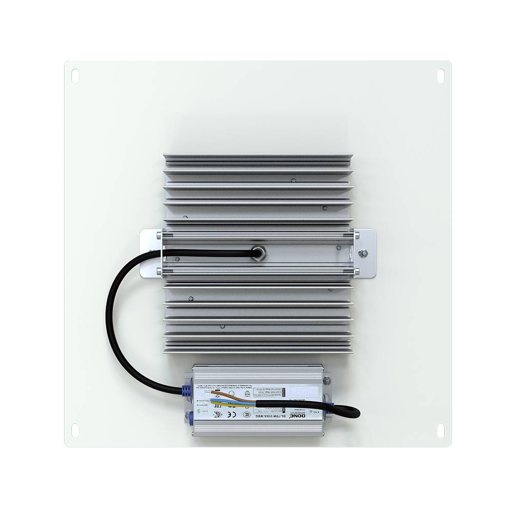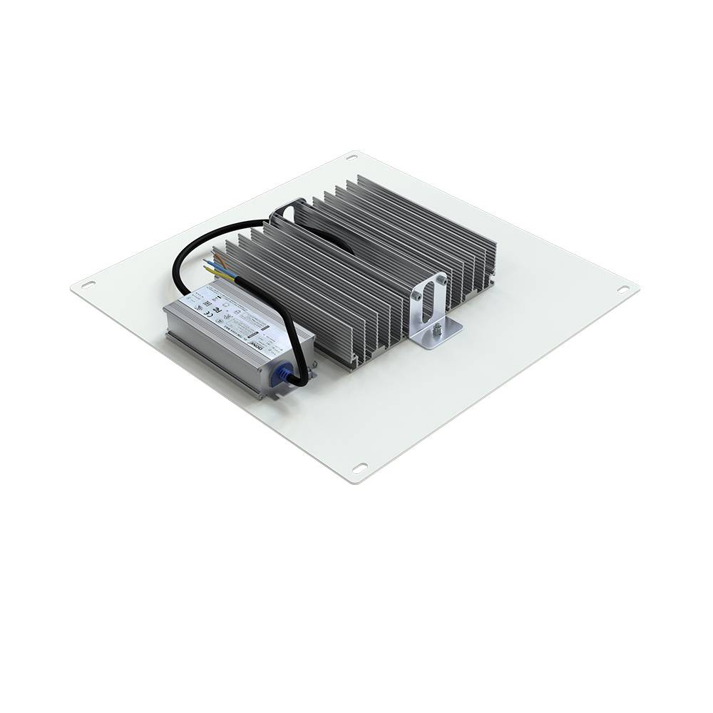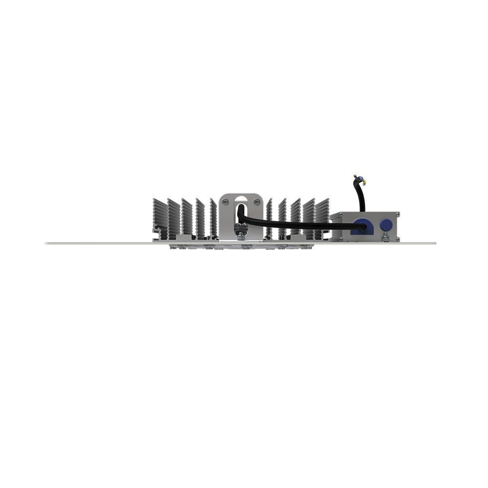 Источник питания расположен снаружи рядом с корпусом, на стальной пластине. Он имеет металлический корпус, который залит теплопроводящим электроизоляционным компаундом. Это снижает степень нагрева электронных компонентов источника питания и положительно отражается на стабильности и продолжительности работы светильника. Кроме того, источник питания эффективно защищен от возникающих помех и импульсов высокой энергии в сети (до 12 кВ). <br />